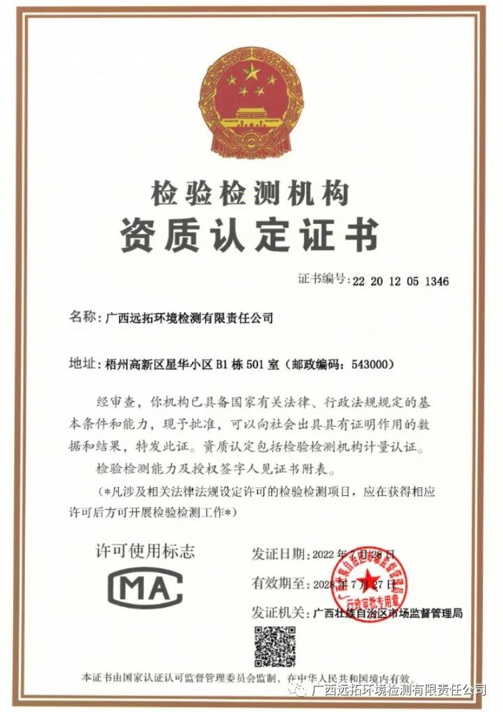 2022年7月28日,广西远拓环境检测有限责任公司顺利通过自治区市场监督局资质认定评审中心的评审与考核,获得检验检测机构资质认定证书,标志着广西远拓环境检测有限责任公司在检测硬件设施、检测能力和管理水平方面均达到省级资质认定标准。